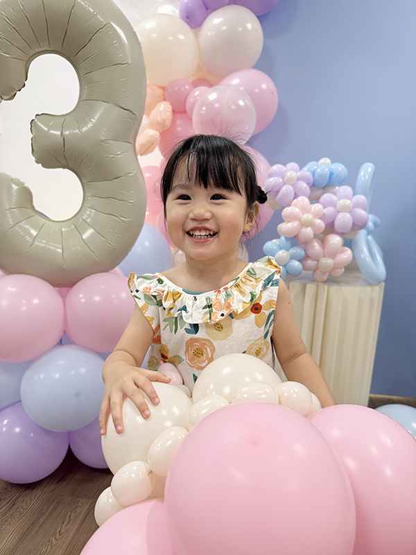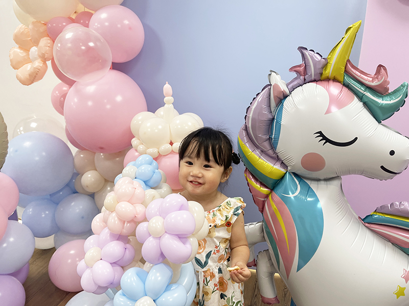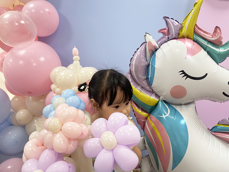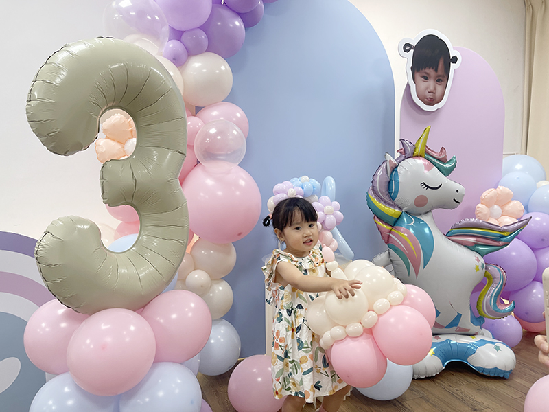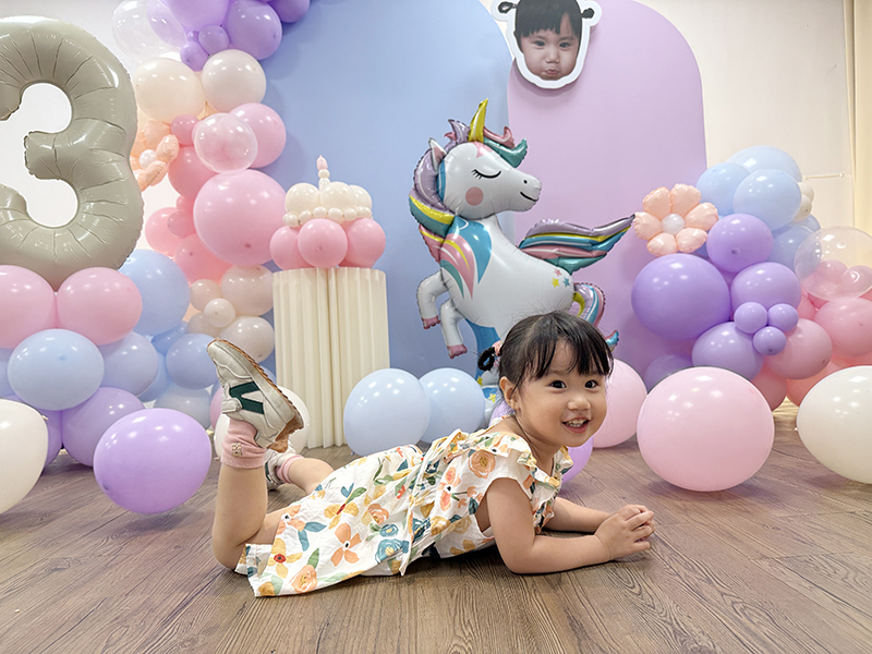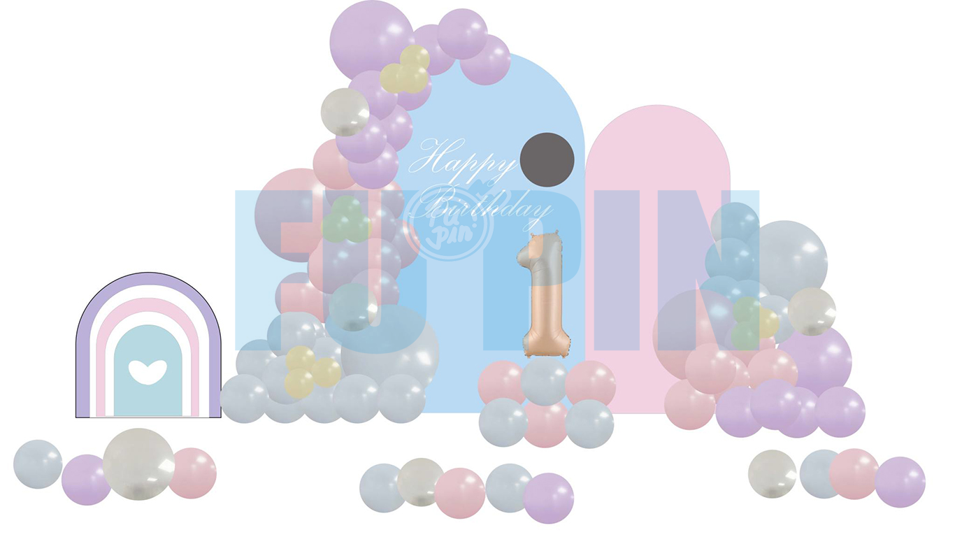 空飄數字1鋁箔42吋+矮球柱x1、空飄鋁箔氣球x2、三角旗吊飾x1、地板空氣氣球15顆 、不規則氣球團、氣球生日蛋糕帽、氣球花束、背板輸出(公版配色、文字)